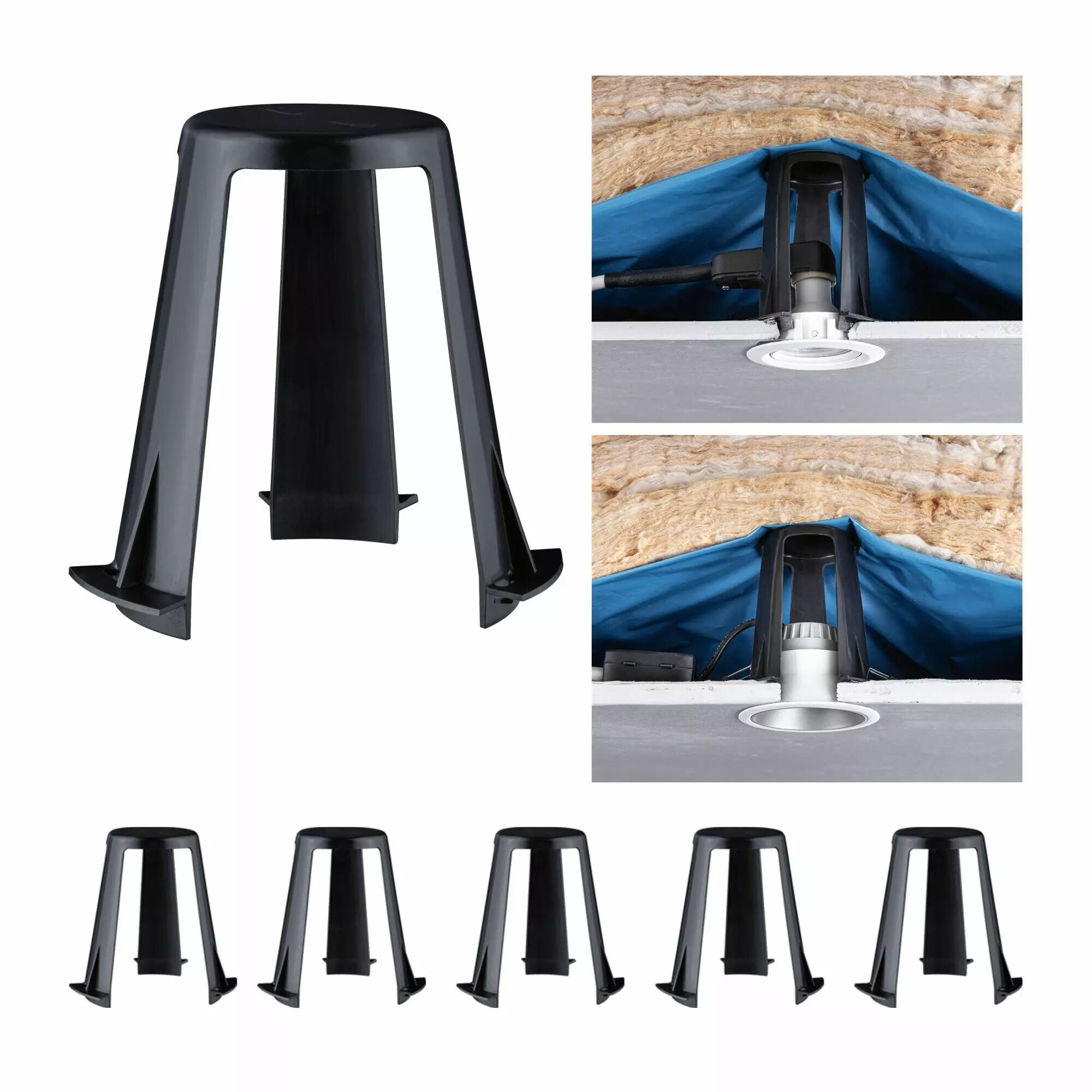 L'entretoise (lot de 5) pour spots encastrés résout les problèmes de tous les types de spots encastrés, qu'ils soient équipés de GU10, Coin oder LED fixe intégrée. Elle permet le montage des spots encastrés même lorsque le faux-plafond contient de l'isolant. L'entretoise crée un écartement fiable entre la LED, le film pare-vapeur et l'isolant et garantit une installation sûre de tous les spots encastrés de taille standard. Les jambes en plastique qui se plient sont une protection pour les spots encastrés de diamètre 62-90 mm.