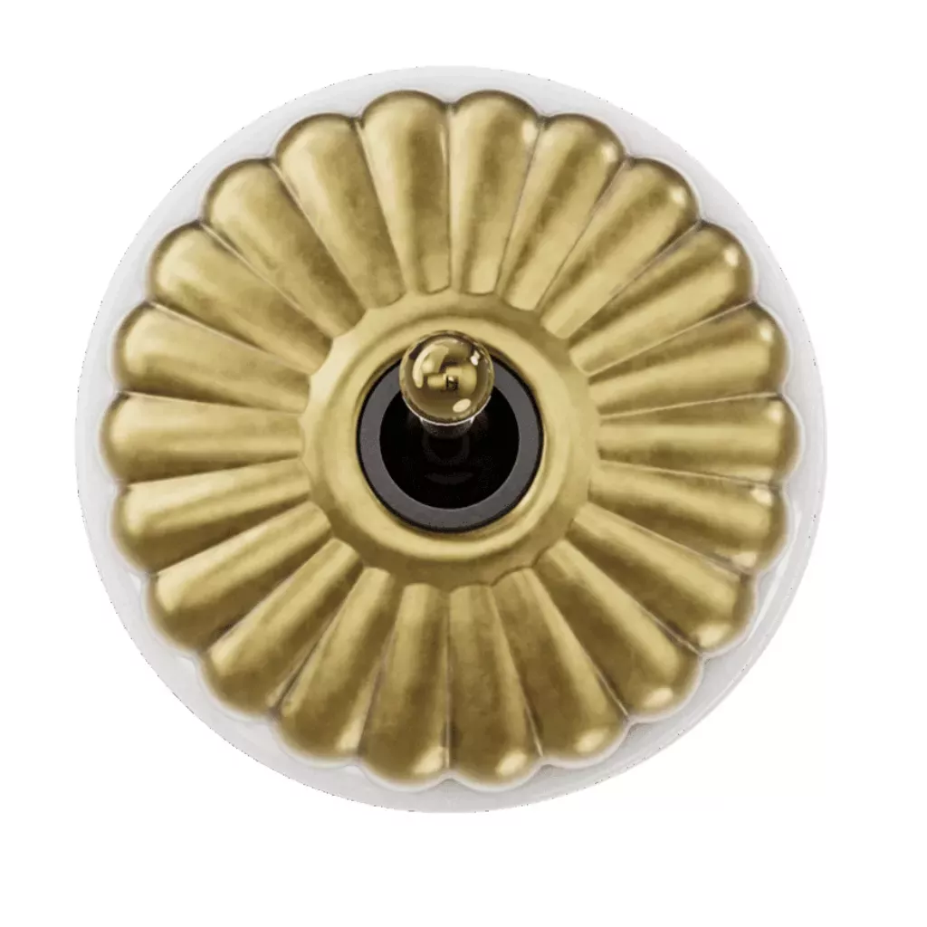 Accueil > Matériel électrique > Prises et interrupteurs > Fontini interrupteurs en saillie Dimbler > Bouton poussoir Dimbler en porcelaine blanche avec dôme charlotte dorée satinée et manette dorée brillante
