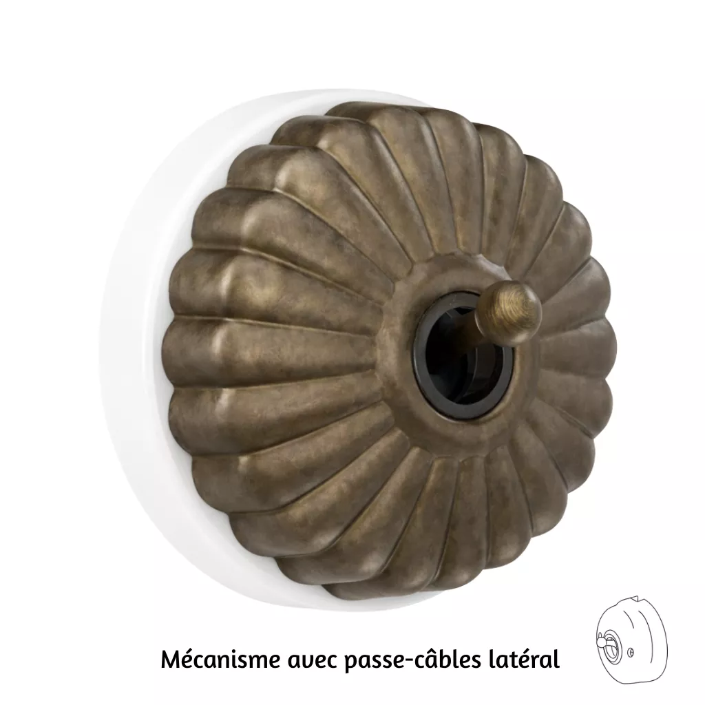Permutateur Dimbler en porcelaine blanche avec dôme charlotte bronze ancien et manette laiton vieilli, avec pasage de câbles