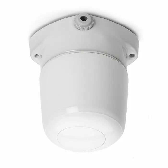 Cette lampe fonctionnelle classique de Lindner possède une base en porcelaine solide sur laquelle est vissé un dôme en verre. Un anneau intermédiaire en caoutchouc assure une étanchéité étendue, de sorte que la lampe convient également à une utilisation en extérieur. Le câble électrique passe par le trou prévu dans la base. Fabriqué depuis plus de 40 ans. Pour montage au plafond ou au mur.