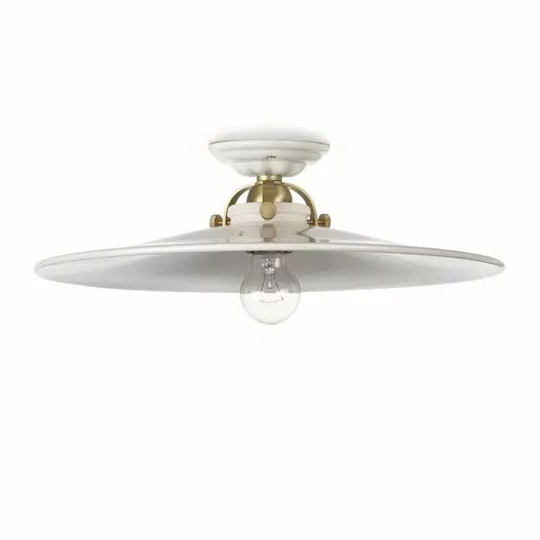 Ces lumières sont destinées à un usage intérieur. Abat-jour en céramique blanc naturel 42 cm Ø, rosace en céramique au plafond en laiton massif. L'ombre est maintenue par trois vis à tête moletée. Hauteur 10,5 cm, Douille métallique E 27 (maxi 60 W), Poids 1,94 kg.
